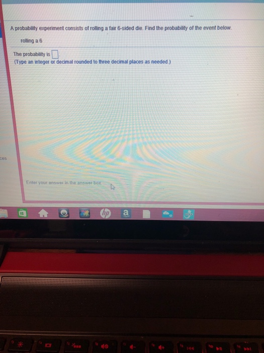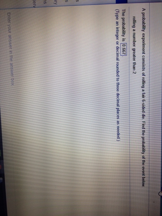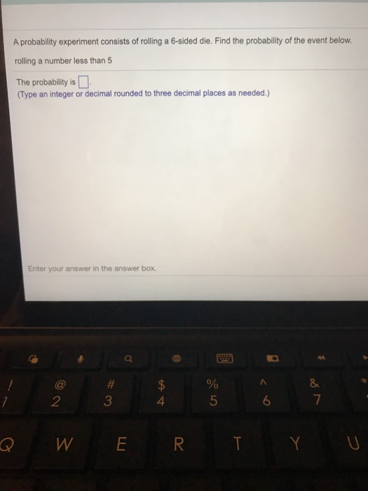 Type an integer or decimal rounded to three decimal places as needed Expert Solution Want to see the full answer. Event Consists of one or more outcomes and is a subset of the. Find the probability of the event below rolling a number less than 4.